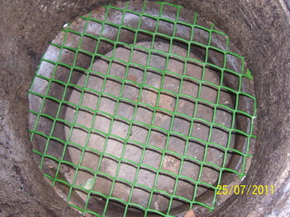 2. Provision of plastic coated metal wire mesh with wide gaps, readily available in the market and very cheap, placed between the bottom concrete ring & 2nd ring now ,instead of aluminum ring weaved with copper wire coated with plastic, which is difficult to manufacture & costly..