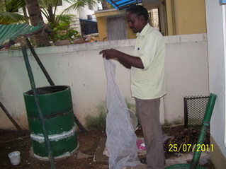 5. Before, I use a powder, trade name “innoculam” which I buy from Bangalore for accelerating the composting process which I sprinkle about 2 spoonful once in 10 days which is very costly. After experimenting with many substitutes, I found out that we can use cottonseed oil cakes. This can be powdered in any grinding machine.1kg of cotton seed oil cake costs only about 20 rupees. This will last about 1 year.