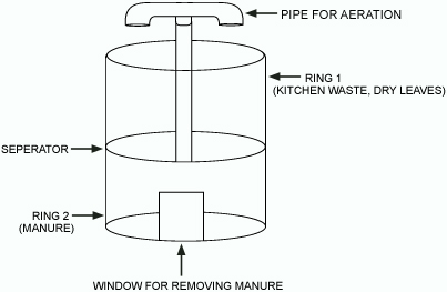 A non-corrosive metal ring with a wire mesh is placed above the last ring. Two more rings are placed on this structure. A perforated vertical plastic partition is provided in these two rings to have two compartments for composting more volumes of waste generation and easy mixing. A small window with a sliding shutter is provided at the bottom ring to enable removal of organic manure periodically.