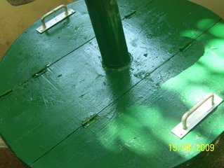 3.The wooden lid with 2 hinged covers at top is costlier, is replaced by F.R.P. sheet with the pipe inserted at the center, which is cheaper, readily available in the market & lighter. Few small bricks can be placed on top of FRP sheet , to avoid flying away by strong wind..